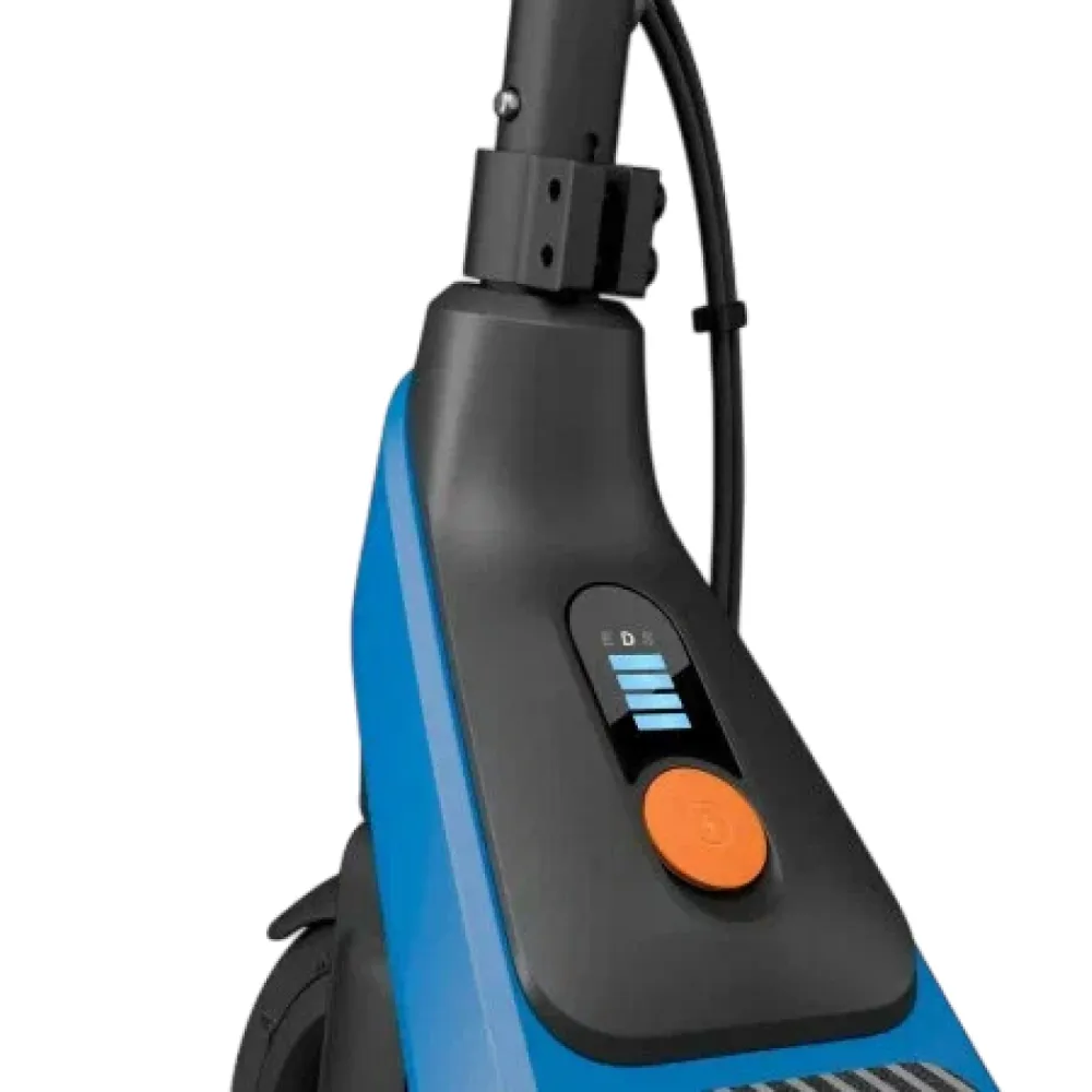 Корпус выполнен из алюминиевого сплава, что делает конструкцию легкой и прочной. Дека удобна для маленьких ног, а складывающийся механизм позволяет компактно транспортировать самокат. На дисплее отображаются основные параметры — скорость, заряд батареи. Управление простое, без дополнительных функций вроде Bluetooth или мобильного приложения.