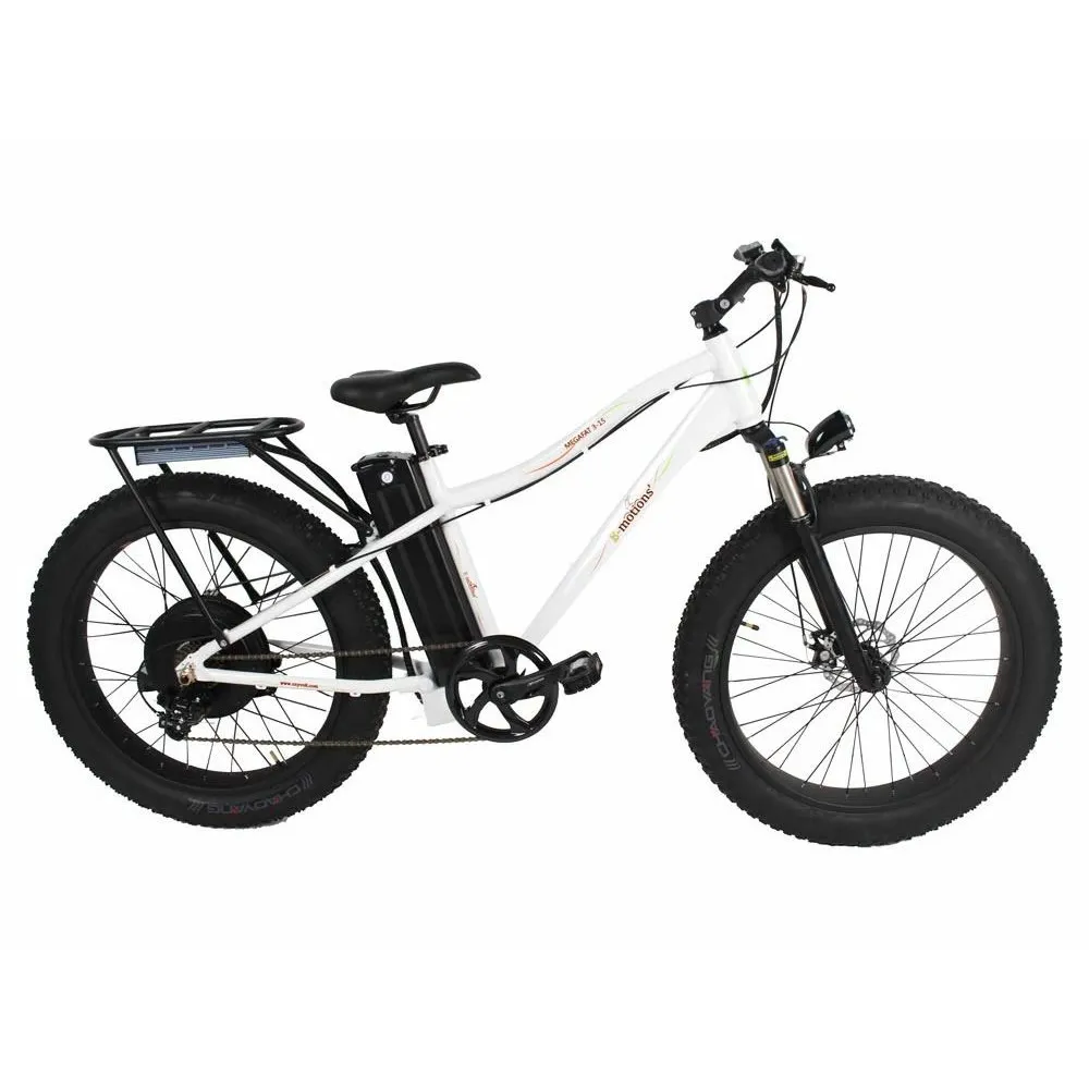 Электрофэтбайк E-motions Megafat 3-15 белый – выглядит броско и привлекательно. Белоснежный велогибрид – лучшее предложение этого года. Приобрести сравнительно легкий байк (32 кг) по лучшей стоимостью могут пользователи грузоподъемностью до 120 кг. Приемлемая стоимость, бонусные предложения и другие преимущества от производителя приятно удивят вас.