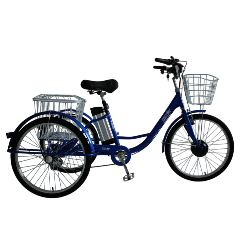 GreenCamel Трайк-24 V3 — трёхколёсный электровелосипед-трицикл для стабильных городских поездок, доставки или отдыха. Низкий центр тяжести обеспечивает устойчивость, максимальная скорость 25 км/ч, нагрузка 150 кг, пробег до 40 км. Идеален для тех, кто ценит безопасность и простоту.